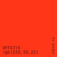Цвет #FF3716 в цветовой модели RGB обозначается тремя октетами (255, 55, 22) в десятичном формате и #FF3716 в шестнадцатиричном (hex) формате, которые являются интенсивностью красного 255 (hex FF), интенсивность зелёного 55 (hex 37) и интенсивность синего 22 (hex 16).