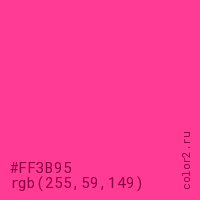 Цвет #FF3B95 в цветовой модели RGB обозначается тремя октетами (255, 59, 149) в десятичном формате и #FF3B95 в шестнадцатиричном (hex) формате, которые являются интенсивностью красного 255 (hex FF), интенсивность зелёного 59 (hex 3B) и интенсивность синего 149 (hex 95).