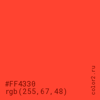 Цвет #FF4330 в цветовой модели RGB обозначается тремя октетами (255, 67, 48) в десятичном формате и #FF4330 в шестнадцатиричном (hex) формате, которые являются интенсивностью красного 255 (hex FF), интенсивность зелёного 67 (hex 43) и интенсивность синего 48 (hex 30).