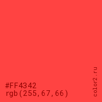 Цвет #FF4342 в цветовой модели RGB обозначается тремя октетами (255, 67, 66) в десятичном формате и #FF4342 в шестнадцатиричном (hex) формате, которые являются интенсивностью красного 255 (hex FF), интенсивность зелёного 67 (hex 43) и интенсивность синего 66 (hex 42).