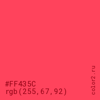 Цвет #FF435C в цветовой модели RGB обозначается тремя октетами (255, 67, 92) в десятичном формате и #FF435C в шестнадцатиричном (hex) формате, которые являются интенсивностью красного 255 (hex FF), интенсивность зелёного 67 (hex 43) и интенсивность синего 92 (hex 5C).