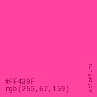 Цвет #FF439F в цветовой модели RGB обозначается тремя октетами (255, 67, 159) в десятичном формате и #FF439F в шестнадцатиричном (hex) формате, которые являются интенсивностью красного 255 (hex FF), интенсивность зелёного 67 (hex 43) и интенсивность синего 159 (hex 9F).