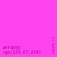 Цвет #FF43EE в цветовой модели RGB обозначается тремя октетами (255, 67, 238) в десятичном формате и #FF43EE в шестнадцатиричном (hex) формате, которые являются интенсивностью красного 255 (hex FF), интенсивность зелёного 67 (hex 43) и интенсивность синего 238 (hex EE).