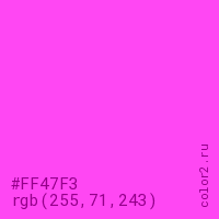 Цвет #FF47F3 в цветовой модели RGB обозначается тремя октетами (255, 71, 243) в десятичном формате и #FF47F3 в шестнадцатиричном (hex) формате, которые являются интенсивностью красного 255 (hex FF), интенсивность зелёного 71 (hex 47) и интенсивность синего 243 (hex F3).