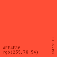 Цвет #FF4E36 в цветовой модели RGB обозначается тремя октетами (255, 78, 54) в десятичном формате и #FF4E36 в шестнадцатиричном (hex) формате, которые являются интенсивностью красного 255 (hex FF), интенсивность зелёного 78 (hex 4E) и интенсивность синего 54 (hex 36).