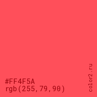 Цвет #FF4F5A в цветовой модели RGB обозначается тремя октетами (255, 79, 90) в десятичном формате и #FF4F5A в шестнадцатиричном (hex) формате, которые являются интенсивностью красного 255 (hex FF), интенсивность зелёного 79 (hex 4F) и интенсивность синего 90 (hex 5A).