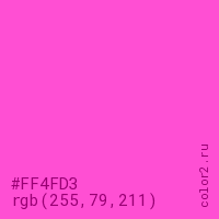 Цвет #FF4FD3 в цветовой модели RGB обозначается тремя октетами (255, 79, 211) в десятичном формате и #FF4FD3 в шестнадцатиричном (hex) формате, которые являются интенсивностью красного 255 (hex FF), интенсивность зелёного 79 (hex 4F) и интенсивность синего 211 (hex D3).