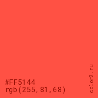 Цвет #FF5144 в цветовой модели RGB обозначается тремя октетами (255, 81, 68) в десятичном формате и #FF5144 в шестнадцатиричном (hex) формате, которые являются интенсивностью красного 255 (hex FF), интенсивность зелёного 81 (hex 51) и интенсивность синего 68 (hex 44).