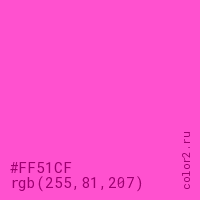 Цвет #FF51CF в цветовой модели RGB обозначается тремя октетами (255, 81, 207) в десятичном формате и #FF51CF в шестнадцатиричном (hex) формате, которые являются интенсивностью красного 255 (hex FF), интенсивность зелёного 81 (hex 51) и интенсивность синего 207 (hex CF).