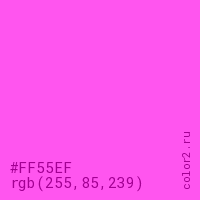 Цвет #FF55EF в цветовой модели RGB обозначается тремя октетами (255, 85, 239) в десятичном формате и #FF55EF в шестнадцатиричном (hex) формате, которые являются интенсивностью красного 255 (hex FF), интенсивность зелёного 85 (hex 55) и интенсивность синего 239 (hex EF).