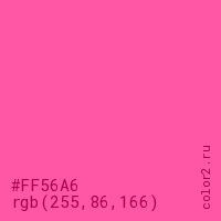 Цвет #FF56A6 в цветовой модели RGB обозначается тремя октетами (255, 86, 166) в десятичном формате и #FF56A6 в шестнадцатиричном (hex) формате, которые являются интенсивностью красного 255 (hex FF), интенсивность зелёного 86 (hex 56) и интенсивность синего 166 (hex A6).