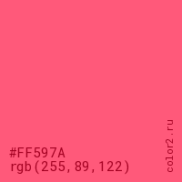 Цвет #FF597A в цветовой модели RGB обозначается тремя октетами (255, 89, 122) в десятичном формате и #FF597A в шестнадцатиричном (hex) формате, которые являются интенсивностью красного 255 (hex FF), интенсивность зелёного 89 (hex 59) и интенсивность синего 122 (hex 7A).