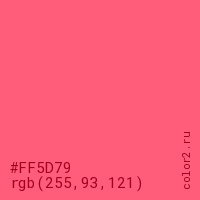 Цвет #FF5D79 в цветовой модели RGB обозначается тремя октетами (255, 93, 121) в десятичном формате и #FF5D79 в шестнадцатиричном (hex) формате, которые являются интенсивностью красного 255 (hex FF), интенсивность зелёного 93 (hex 5D) и интенсивность синего 121 (hex 79).