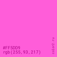 Цвет #FF5DD9 в цветовой модели RGB обозначается тремя октетами (255, 93, 217) в десятичном формате и #FF5DD9 в шестнадцатиричном (hex) формате, которые являются интенсивностью красного 255 (hex FF), интенсивность зелёного 93 (hex 5D) и интенсивность синего 217 (hex D9).