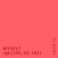 Цвет #FF5F67 в цветовой модели RGB обозначается тремя октетами (255, 95, 103) в десятичном формате и #FF5F67 в шестнадцатиричном (hex) формате, которые являются интенсивностью красного 255 (hex FF), интенсивность зелёного 95 (hex 5F) и интенсивность синего 103 (hex 67).