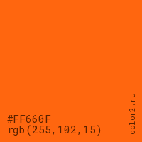 Цвет #FF660F в цветовой модели RGB обозначается тремя октетами (255, 102, 15) в десятичном формате и #FF660F в шестнадцатиричном (hex) формате, которые являются интенсивностью красного 255 (hex FF), интенсивность зелёного 102 (hex 66) и интенсивность синего 15 (hex 0F).
