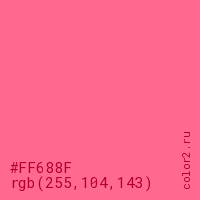 Цвет #FF688F в цветовой модели RGB обозначается тремя октетами (255, 104, 143) в десятичном формате и #FF688F в шестнадцатиричном (hex) формате, которые являются интенсивностью красного 255 (hex FF), интенсивность зелёного 104 (hex 68) и интенсивность синего 143 (hex 8F).