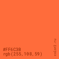 Цвет #FF6C3B в цветовой модели RGB обозначается тремя октетами (255, 108, 59) в десятичном формате и #FF6C3B в шестнадцатиричном (hex) формате, которые являются интенсивностью красного 255 (hex FF), интенсивность зелёного 108 (hex 6C) и интенсивность синего 59 (hex 3B).