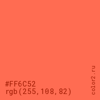Цвет #FF6C52 в цветовой модели RGB обозначается тремя октетами (255, 108, 82) в десятичном формате и #FF6C52 в шестнадцатиричном (hex) формате, которые являются интенсивностью красного 255 (hex FF), интенсивность зелёного 108 (hex 6C) и интенсивность синего 82 (hex 52).