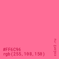 Цвет #FF6C96 в цветовой модели RGB обозначается тремя октетами (255, 108, 150) в десятичном формате и #FF6C96 в шестнадцатиричном (hex) формате, которые являются интенсивностью красного 255 (hex FF), интенсивность зелёного 108 (hex 6C) и интенсивность синего 150 (hex 96).