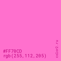 Цвет #FF70CD в цветовой модели RGB обозначается тремя октетами (255, 112, 205) в десятичном формате и #FF70CD в шестнадцатиричном (hex) формате, которые являются интенсивностью красного 255 (hex FF), интенсивность зелёного 112 (hex 70) и интенсивность синего 205 (hex CD).