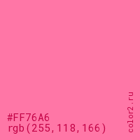 Цвет #FF76A6 в цветовой модели RGB обозначается тремя октетами (255, 118, 166) в десятичном формате и #FF76A6 в шестнадцатиричном (hex) формате, которые являются интенсивностью красного 255 (hex FF), интенсивность зелёного 118 (hex 76) и интенсивность синего 166 (hex A6).