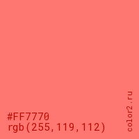 Цвет #FF7770 в цветовой модели RGB обозначается тремя октетами (255, 119, 112) в десятичном формате и #FF7770 в шестнадцатиричном (hex) формате, которые являются интенсивностью красного 255 (hex FF), интенсивность зелёного 119 (hex 77) и интенсивность синего 112 (hex 70).