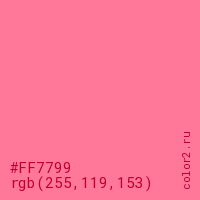 Цвет #FF7799 в цветовой модели RGB обозначается тремя октетами (255, 119, 153) в десятичном формате и #FF7799 в шестнадцатиричном (hex) формате, которые являются интенсивностью красного 255 (hex FF), интенсивность зелёного 119 (hex 77) и интенсивность синего 153 (hex 99).