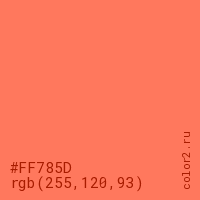 Цвет #FF785D в цветовой модели RGB обозначается тремя октетами (255, 120, 93) в десятичном формате и #FF785D в шестнадцатиричном (hex) формате, которые являются интенсивностью красного 255 (hex FF), интенсивность зелёного 120 (hex 78) и интенсивность синего 93 (hex 5D).