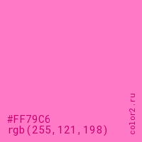 Цвет RGB(255, 121, 198) в процентом отношении количества цвета состоит из 100% красного (red), 47.5% зелёного (green) и 77.6% синего (blue).