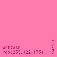 Цвет #FF7AAF в цветовой модели RGB обозначается тремя октетами (255, 122, 175) в десятичном формате и #FF7AAF в шестнадцатиричном (hex) формате, которые являются интенсивностью красного 255 (hex FF), интенсивность зелёного 122 (hex 7A) и интенсивность синего 175 (hex AF).