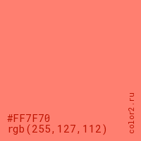 Цвет #FF7F70 в цветовой модели RGB обозначается тремя октетами (255, 127, 112) в десятичном формате и #FF7F70 в шестнадцатиричном (hex) формате, которые являются интенсивностью красного 255 (hex FF), интенсивность зелёного 127 (hex 7F) и интенсивность синего 112 (hex 70).