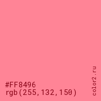 Цвет #FF8496 в цветовой модели RGB обозначается тремя октетами (255, 132, 150) в десятичном формате и #FF8496 в шестнадцатиричном (hex) формате, которые являются интенсивностью красного 255 (hex FF), интенсивность зелёного 132 (hex 84) и интенсивность синего 150 (hex 96).
