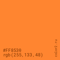 Цвет #FF8530 в цветовой модели RGB обозначается тремя октетами (255, 133, 48) в десятичном формате и #FF8530 в шестнадцатиричном (hex) формате, которые являются интенсивностью красного 255 (hex FF), интенсивность зелёного 133 (hex 85) и интенсивность синего 48 (hex 30).