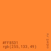 Цвет #FF8531 в цветовой модели RGB обозначается тремя октетами (255, 133, 49) в десятичном формате и #FF8531 в шестнадцатиричном (hex) формате, которые являются интенсивностью красного 255 (hex FF), интенсивность зелёного 133 (hex 85) и интенсивность синего 49 (hex 31).