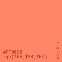 Цвет #FF8668 в цветовой модели RGB обозначается тремя октетами (255, 134, 104) в десятичном формате и #FF8668 в шестнадцатиричном (hex) формате, которые являются интенсивностью красного 255 (hex FF), интенсивность зелёного 134 (hex 86) и интенсивность синего 104 (hex 68).