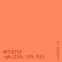 Цвет #FF875F в цветовой модели RGB обозначается тремя октетами (255, 135, 95) в десятичном формате и #FF875F в шестнадцатиричном (hex) формате, которые являются интенсивностью красного 255 (hex FF), интенсивность зелёного 135 (hex 87) и интенсивность синего 95 (hex 5F).
