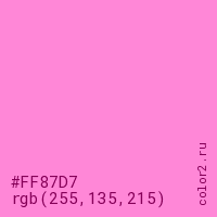 Цвет #FF87D7 в цветовой модели RGB обозначается тремя октетами (255, 135, 215) в десятичном формате и #FF87D7 в шестнадцатиричном (hex) формате, которые являются интенсивностью красного 255 (hex FF), интенсивность зелёного 135 (hex 87) и интенсивность синего 215 (hex D7).