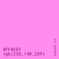 Цвет #FF8CEF в цветовой модели RGB обозначается тремя октетами (255, 140, 239) в десятичном формате и #FF8CEF в шестнадцатиричном (hex) формате, которые являются интенсивностью красного 255 (hex FF), интенсивность зелёного 140 (hex 8C) и интенсивность синего 239 (hex EF).