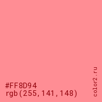 Цвет #FF8D94 в цветовой модели RGB обозначается тремя октетами (255, 141, 148) в десятичном формате и #FF8D94 в шестнадцатиричном (hex) формате, которые являются интенсивностью красного 255 (hex FF), интенсивность зелёного 141 (hex 8D) и интенсивность синего 148 (hex 94).