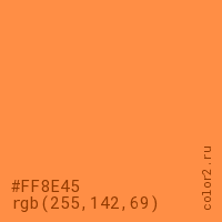 Цвет #FF8E45 в цветовой модели RGB обозначается тремя октетами (255, 142, 69) в десятичном формате и #FF8E45 в шестнадцатиричном (hex) формате, которые являются интенсивностью красного 255 (hex FF), интенсивность зелёного 142 (hex 8E) и интенсивность синего 69 (hex 45).