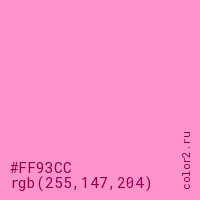 Цвет #FF93CC в цветовой модели RGB обозначается тремя октетами (255, 147, 204) в десятичном формате и #FF93CC в шестнадцатиричном (hex) формате, которые являются интенсивностью красного 255 (hex FF), интенсивность зелёного 147 (hex 93) и интенсивность синего 204 (hex CC).