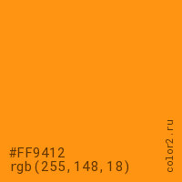 Цвет #FF9412 в цветовой модели RGB обозначается тремя октетами (255, 148, 18) в десятичном формате и #FF9412 в шестнадцатиричном (hex) формате, которые являются интенсивностью красного 255 (hex FF), интенсивность зелёного 148 (hex 94) и интенсивность синего 18 (hex 12).