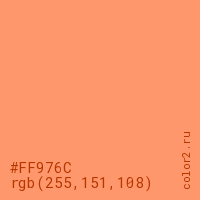 Цвет #FF976C в цветовой модели RGB обозначается тремя октетами (255, 151, 108) в десятичном формате и #FF976C в шестнадцатиричном (hex) формате, которые являются интенсивностью красного 255 (hex FF), интенсивность зелёного 151 (hex 97) и интенсивность синего 108 (hex 6C).