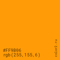 Цвет #FF9B06 в цветовой модели RGB обозначается тремя октетами (255, 155, 6) в десятичном формате и #FF9B06 в шестнадцатиричном (hex) формате, которые являются интенсивностью красного 255 (hex FF), интенсивность зелёного 155 (hex 9B) и интенсивность синего 6 (hex 06).
