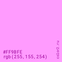 Цвет #FF9BFE в цветовой модели RGB обозначается тремя октетами (255, 155, 254) в десятичном формате и #FF9BFE в шестнадцатиричном (hex) формате, которые являются интенсивностью красного 255 (hex FF), интенсивность зелёного 155 (hex 9B) и интенсивность синего 254 (hex FE).