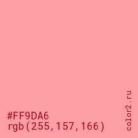 Цвет #FF9DA6 в цветовой модели RGB обозначается тремя октетами (255, 157, 166) в десятичном формате и #FF9DA6 в шестнадцатиричном (hex) формате, которые являются интенсивностью красного 255 (hex FF), интенсивность зелёного 157 (hex 9D) и интенсивность синего 166 (hex A6).