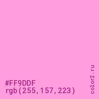 Цвет #FF9DDF в цветовой модели RGB обозначается тремя октетами (255, 157, 223) в десятичном формате и #FF9DDF в шестнадцатиричном (hex) формате, которые являются интенсивностью красного 255 (hex FF), интенсивность зелёного 157 (hex 9D) и интенсивность синего 223 (hex DF).