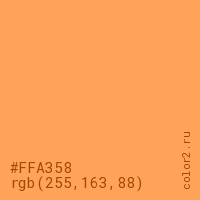 Цвет #FFA358 в цветовой модели RGB обозначается тремя октетами (255, 163, 88) в десятичном формате и #FFA358 в шестнадцатиричном (hex) формате, которые являются интенсивностью красного 255 (hex FF), интенсивность зелёного 163 (hex A3) и интенсивность синего 88 (hex 58).