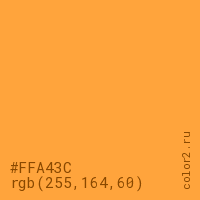 Цвет #FFA43C в цветовой модели RGB обозначается тремя октетами (255, 164, 60) в десятичном формате и #FFA43C в шестнадцатиричном (hex) формате, которые являются интенсивностью красного 255 (hex FF), интенсивность зелёного 164 (hex A4) и интенсивность синего 60 (hex 3C).